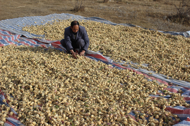 在东沟乡尔开村玛咖种植基地里,村民们有的在采挖,有的在忙着清洗,县农业园区的技术人员还深入现场组织指导晾晒和销售,田间地头里也呈现出热火朝天劳动景象。